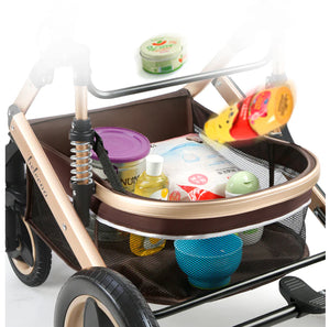Accesoriile incluse, precum husa pentru picioare, salteaua moale si cosul spatios, il transforma intr-o solutie practica si eleganta pentru parinti