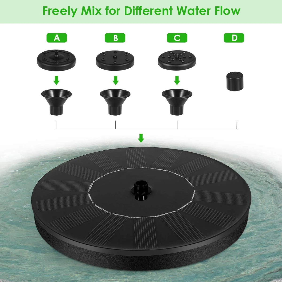 - 4 duze - Fantana solara vine cu 4 accesorii, pentru forme si modele diferite de pulverizare dorite. Inaltimea de pulverizare poate ajunge pana la 40 centrimetri in functie de puterea razelor solare.