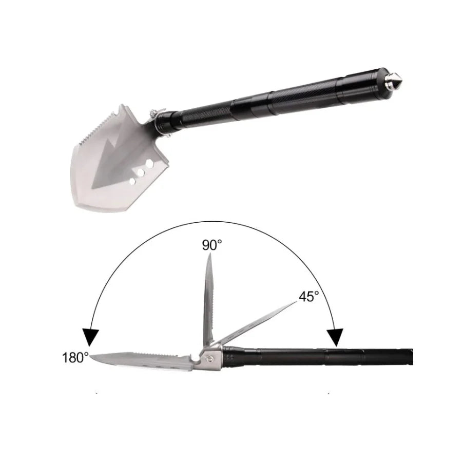 Lopata pliabila multifunctionala va satisface nevoile tuturor utilizatorilor carora le place sa-si petreaca timpul liber in natura. Lopata multifunctionala este excelenta pentru camping, expeditii cercetase sau poate fi folosita in gradina. Lopata este fabricata din otel, manerul are o suprafată zimtata pentru o mai buna prindere. Lopata este multifunctionala, deoarece ofera diverse modificari. Capul lopetii este schimbabil cu un ferastrau, deschizator de sticle, topor, metru cu o valoare de pana la zece centimetri. Lopata este reglabila la 180 de grade, ceea ce permite folosirea lamei ca sapa. Manerul lopetii este impartit in doua parti, pe care le desurubati pur si simplu. In maner veti gasi un cutit tactic, un fluier si un silex / amnar pentru foc. Capatul manerului ofera un varf metalic pentru spargerea de urgenta a geamului. Intreaga lopata multifunctionala este pliata intr-un pachet cu model de camuflaj. Produsul este potrivit pentru persoane de peste 18 ani sau cu supravegherea unui adult.