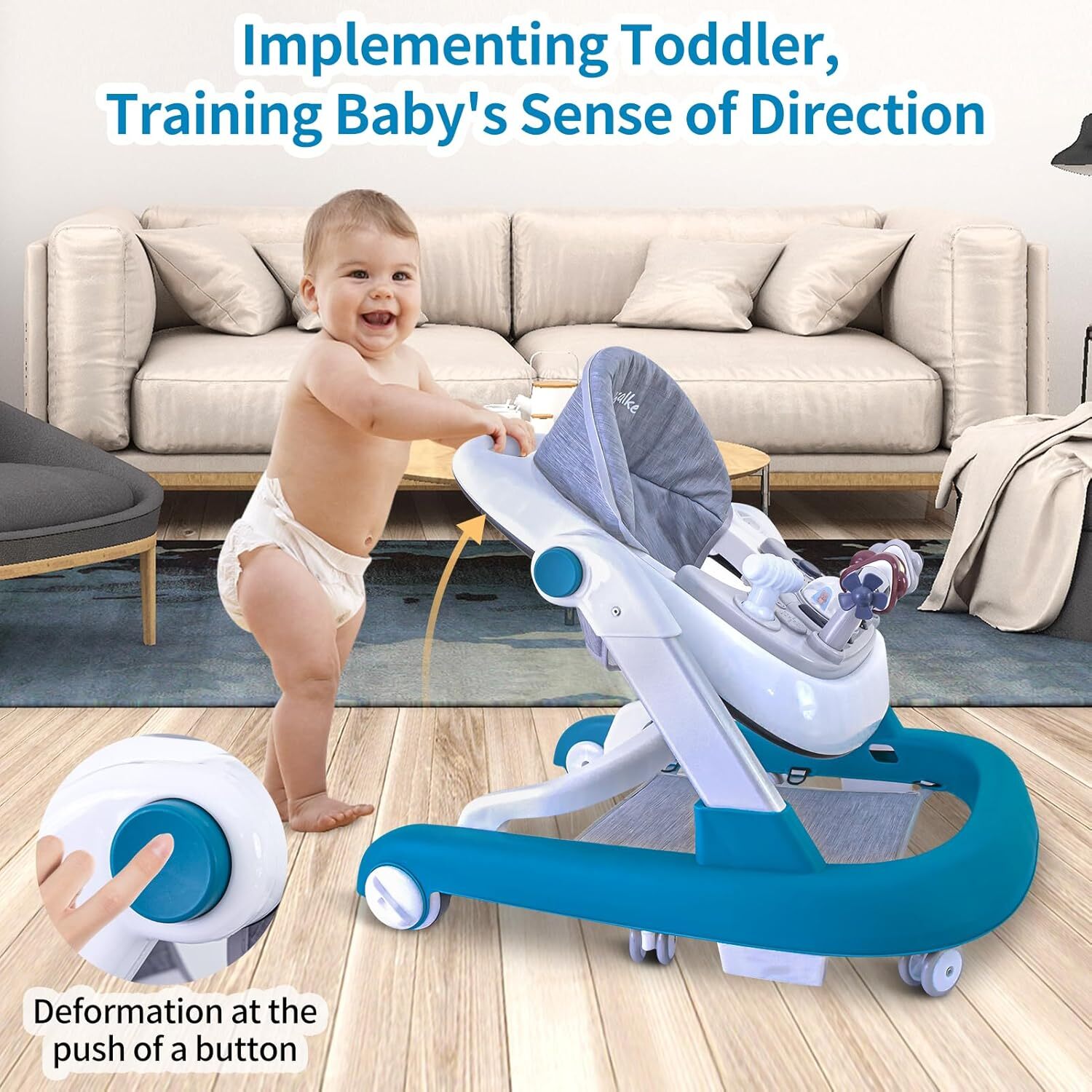 Utilizare ca antemergător: când copilul începe să meargă mai sigur, produsul poate fi folosit cu mânerul din spate pentru împingere – de către micuț sau părinte