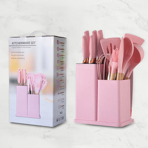 Set Ustensile Bucătărie 19 Piese – Silicon Termorezistent & Mânere din Lemn Antibacterian + Suport Inclus