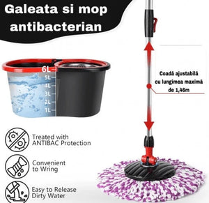 Sistemul rotativ integrat indeparteaza excesul de apa si curata mopul dupa fiecare utilizare.