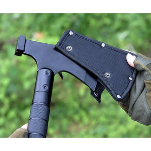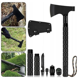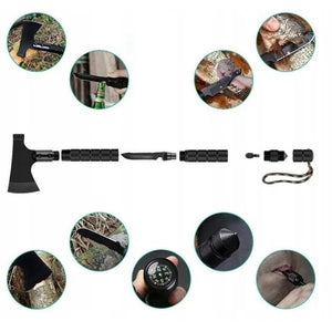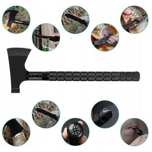 Topor Multifunctional 6 in 1 cu Cutit, Amnar, Busola si Fluier, 43,5 cm, Otel 420, Negru